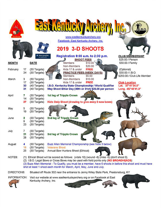East Kentucky Archery Outdoor-3D Feb 17 30 Targets Feb 24 30 Targets Mar 3 30 Targets Mar 17 30 Targets Mar 30/31 IBO Ky State Championship/World Qualifier Apr 7 30 Targets 1st Leg Triple Crown Apr 14 30 Targets Apr 27 30 Targets Kids only drawing for 2 new bows May 5 30 Targets May 19 30 Targets Jun 2 30 Targets 2nd Leg Triple Crown Jun 9 30 Targets Jun 23 30 Targets Jul 7 30 Targets Jul 21 30 Targets 3rd Leg Triple Crown Jul 28 30 Targets Aug 4 30 Targets Buzz Allen Memorial Championship Aug 18 30 Targets Veterans Shoot Aug 25 30 Targets Annual Bow Hunters Shoot (Ethical) Website | facebook | flyer |