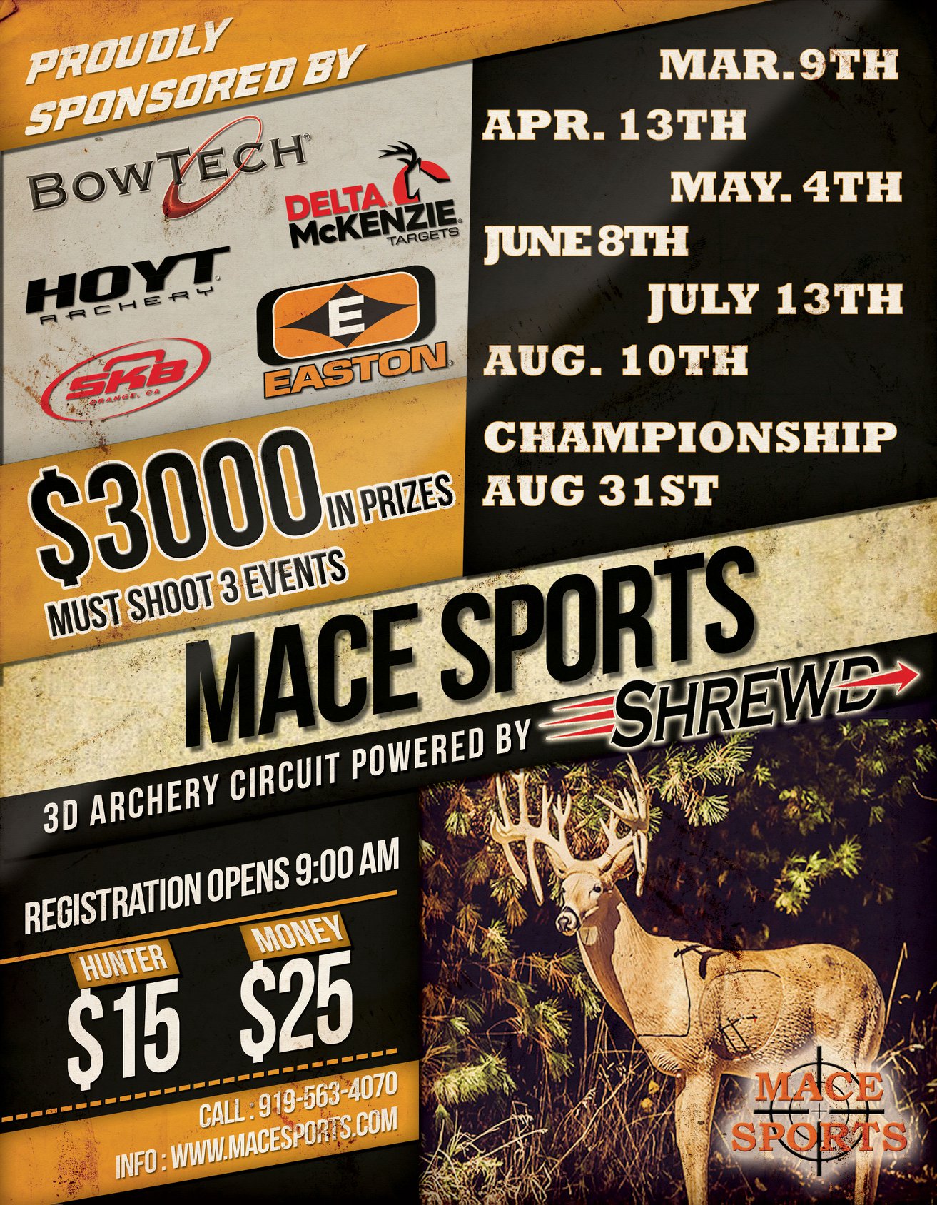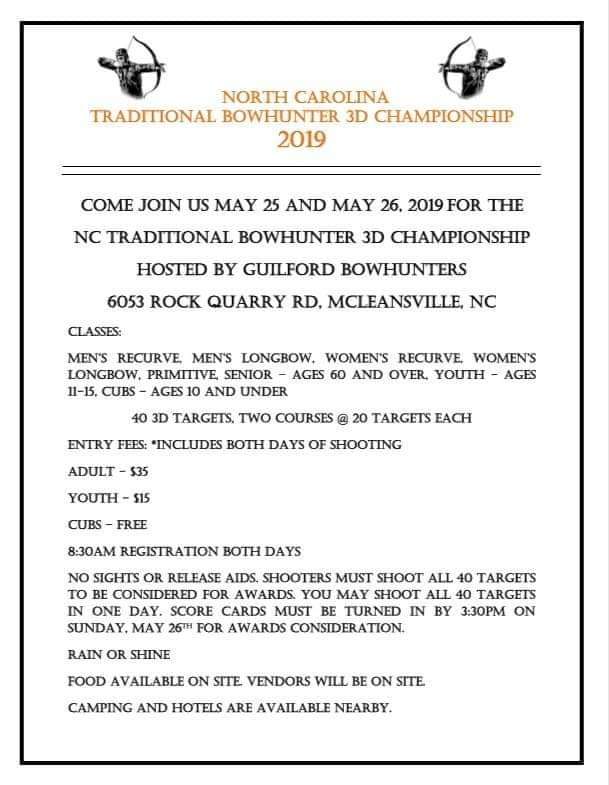 Mace Sports Archery Range Outdoor-3D Mar 9 Apr 13 May 4 Jun 15 Jul 13 Aug 10 Aug 31 facebook | flyer Guilford Bowhunters Outdoor-3D May 25/26 NC Traditional Bowhunter 3D Championship flyer |