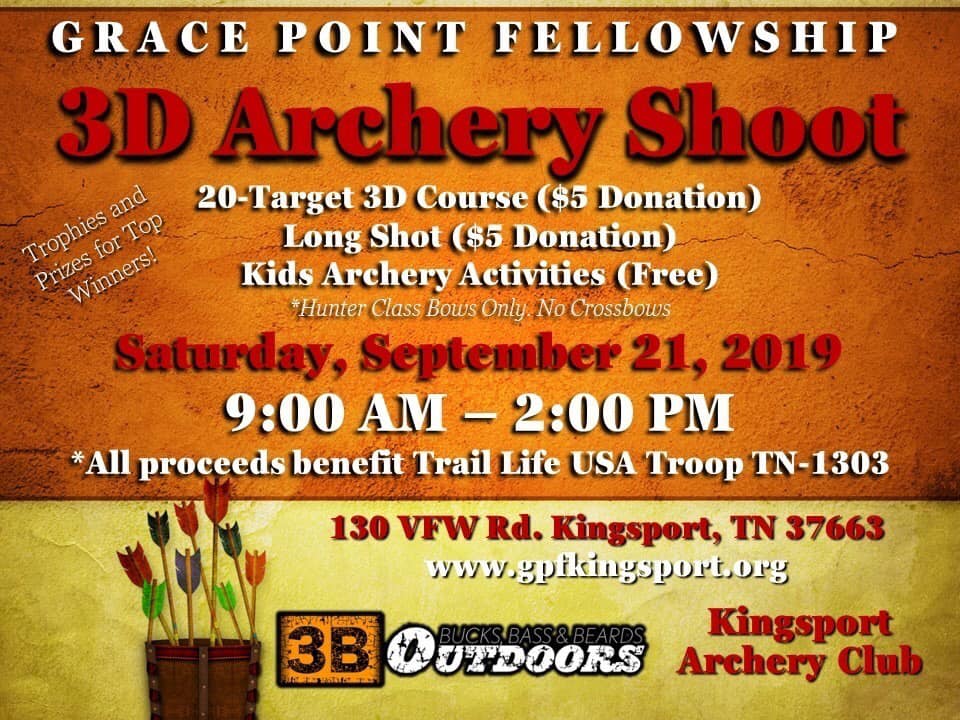 Big Pine Outdoor-3D Mar 16/17 Apr 13/14 May 11 Jun 15 Jul 6/7 Jul 27/28 Mel Story Memorial Benefit Shoot Aug 17 Championship RESULTS ? Aug 18 Fun Shoot RESULTS ? * must shoot 2 shoots to qualify for Championship Grace Point Fellowship Church Outdoor-3D Sep 21 Trail Life USA Troop TN-1303 Benefit Shoot Flyer/More Info |