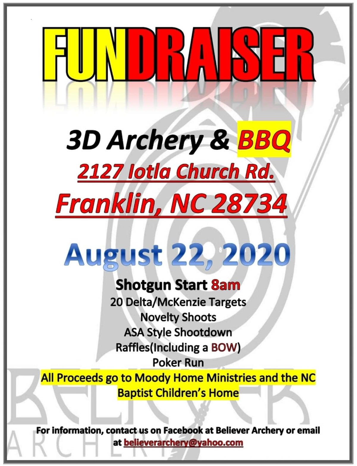 Believer Archery Outdoor-3D Feb 15/16 English Farm Feb 29/Mar 1 English Farm Apr 18/19 Moody Farm (fundraiser for NC Baptist Children Home) Cancelled May 2/3 Moody Farm Jun 20/21 Moody Farm Jul 18/19 Moody Farm Aug 22 Moody Farm Championship/Childrens Home Fundraiser flyer Sep 5 Candler NC flyer |