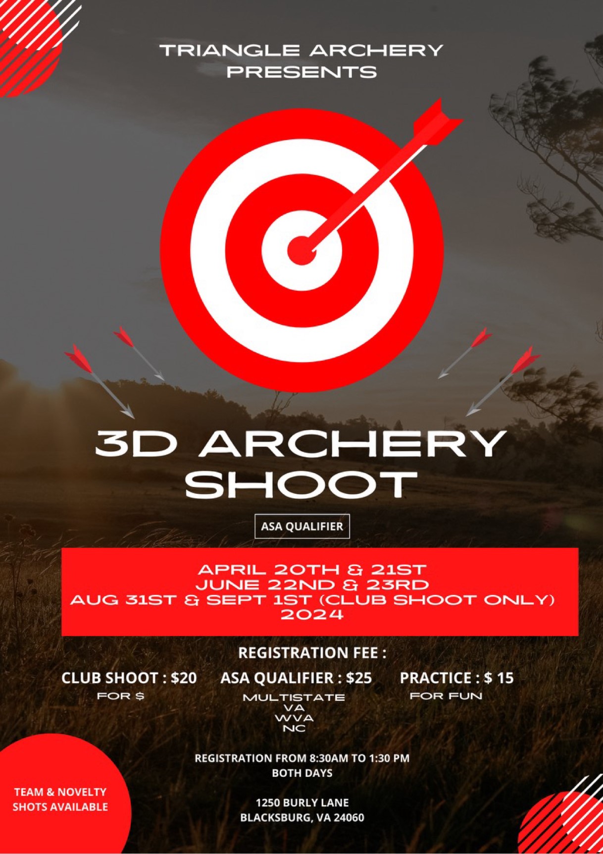 South Mountain Bowhunters Outdoor-3D Feb 17/18 Mar 16/17 Apr 6/7 Forsyth Archery Club at Claybreakers Outdoor-3D Apr 21 Apr 28 NC/SC/Va/WV ASA Qualifier flyer Jun 9 Aug 25 Open 3D flyer Dec 8 Map |